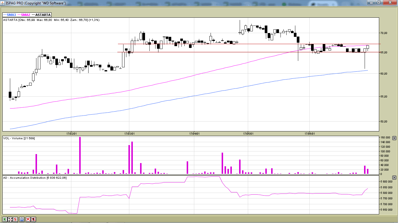 Na wykresie akcji spółki na piątkowej sesji powstała świeczka wzrostowa na wsparciu przy znaczącym wolumenie. Może to być zapowiedź chęci zakończenia płaskiej korekty, przebicia oporów na 69 zł oraz 69,50 zł i możliwości rozpoczęcia kolejnej fali wzrostowej. Zagrywamy na przebicie oporu na 69,50 zł.