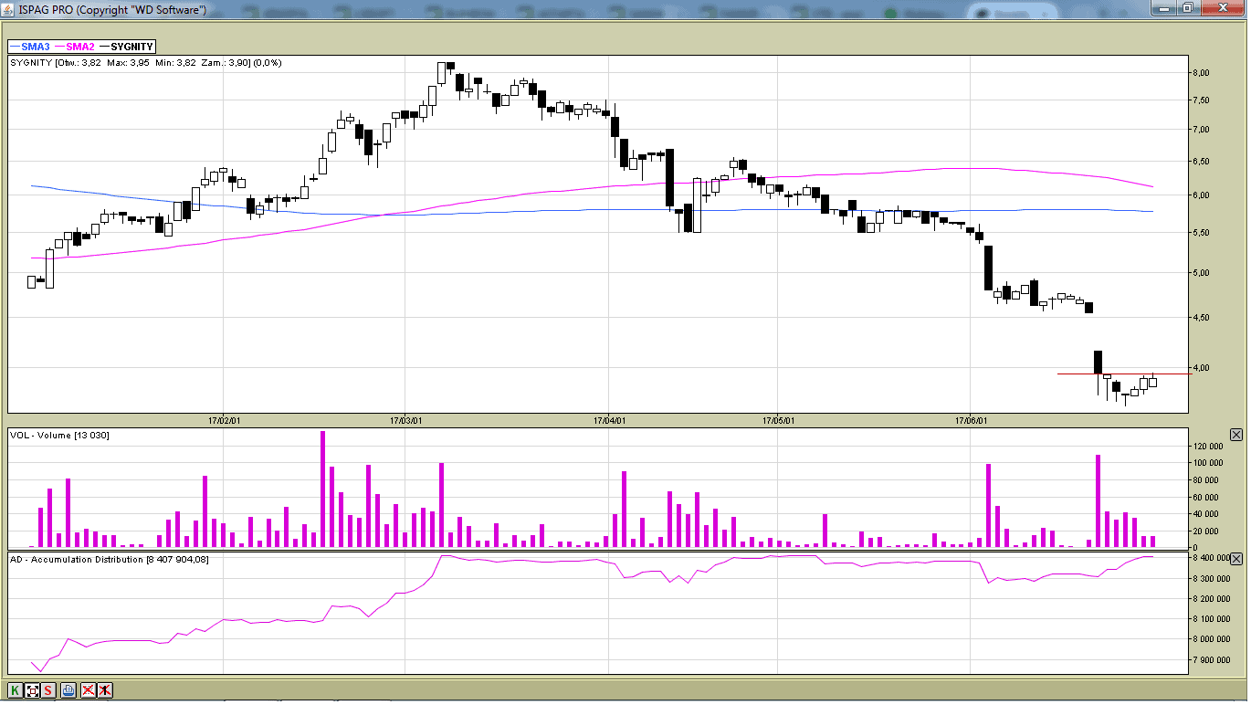 Kurs akcji znajduje się w trendzie spadkowym. Na wykresie widać konsolidowanie się kursu pod czerwoną linią. Zagranie bardzo spekulacyjne na wybicie zaznaczonego oporu.