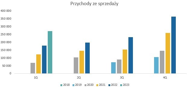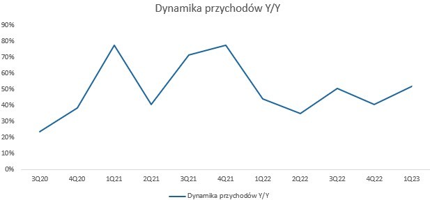 ANR zwrócił moją uwagę podając szacunkowe wyniki przychodów za pierwszy kwartał 2023, które to wzrosły rok do roku o 52% – należy oczywiście pamiętać, że w pierwszym kwartale zeszłego roku miał miejsce atak Rosji na Ukrainę i wyniki wielu spółek w tym okresie były zaburzone. Wspomniany raport skłonił mnie do bliższego przyjrzenia się spółce i muszę szczerze powiedzieć, że dynamiki przychodów od początku działalności spółki wyglądają imponująco. Poniższy wykres przedstawia wspomniane dynamiki: