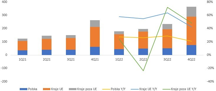 Oczywiście Answer to młoda spółka a z reguły w przypadku takich podmiotów najdynamiczniejsze wzrosty mają miejsce na początku rozwoju spółki. Niezbyt wysoka baza za 2Q22 (na który w mojej ocenie również negatywny wpływ miała wojna na Ukrainie) pozwala zakładać, że tegoroczne dynamiki będą na poziomie 35-50%. Jeżeli spojrzymy na rozbicie przychodów na regiony sprzedaży to najdynamiczniej rośnie sprzedaż do krajów UE (z wyłączeniem Polski):