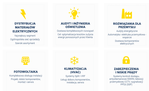 Grupa wykonuje usługi w zakresie projektów oświetleniowych elektrycznych, audytów, wykonywania oraz modernizacji instalacji elektrycznych i energetycznych, programowania automatyki budynkowej. Jest też dostawcą złożonych rozwiązań dla przemysłu (m. in. firm produkcyjnych, producentów maszyn i integratorów systemów). Głównym obszarem działalności Grupy jest zapewnienie inwestorowi kompleksowych rozwiązań związanych z prądem do każdego typu obiektu budowlanego. Działalność Grupy Emitenta obejmuje sześć obszarów:
