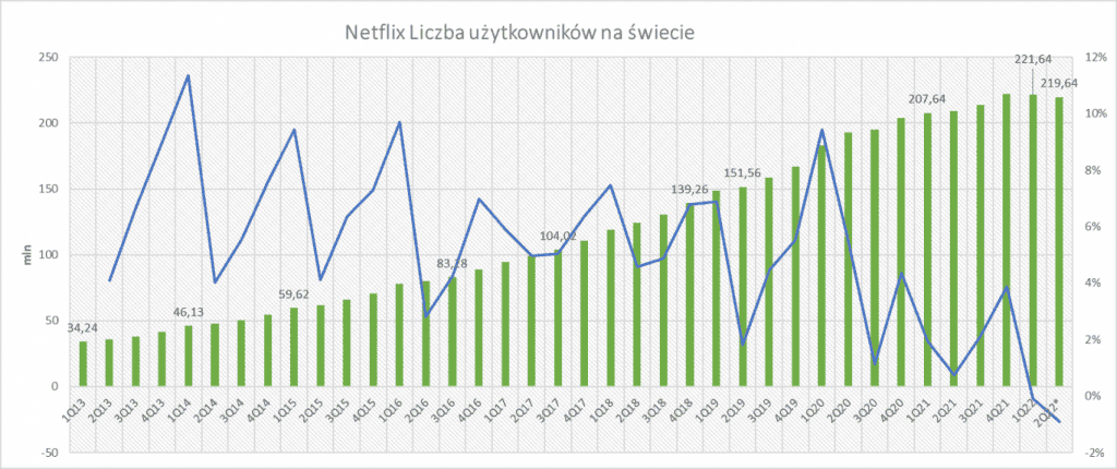 Natomiast jeżeli uwzględnimy dane szacunkowe na 2Q22 i dane historyczne dotyczące liczby subskrybentów, możemy zobaczyć sukcesywny spadek dynamiki nowych subskrybentów – i spadek w roku 2022: