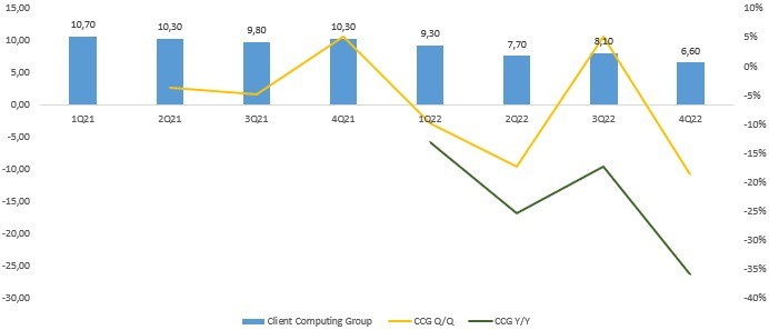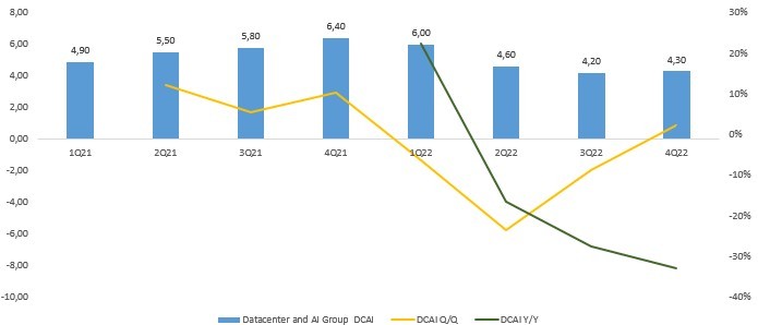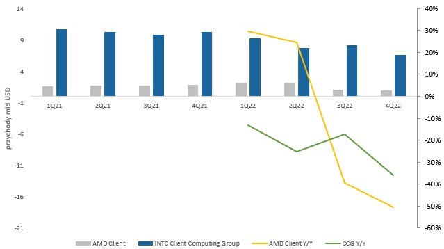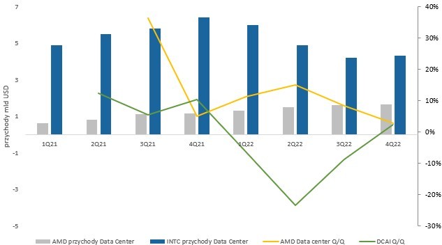 Przychody s segmentu DCAI wyniosły 4,3 mld USD i były Y/Y niższe aż o blisko 33% natomiast Q/Q odnotowaliśmy poprawę na poziomie 2,38%.