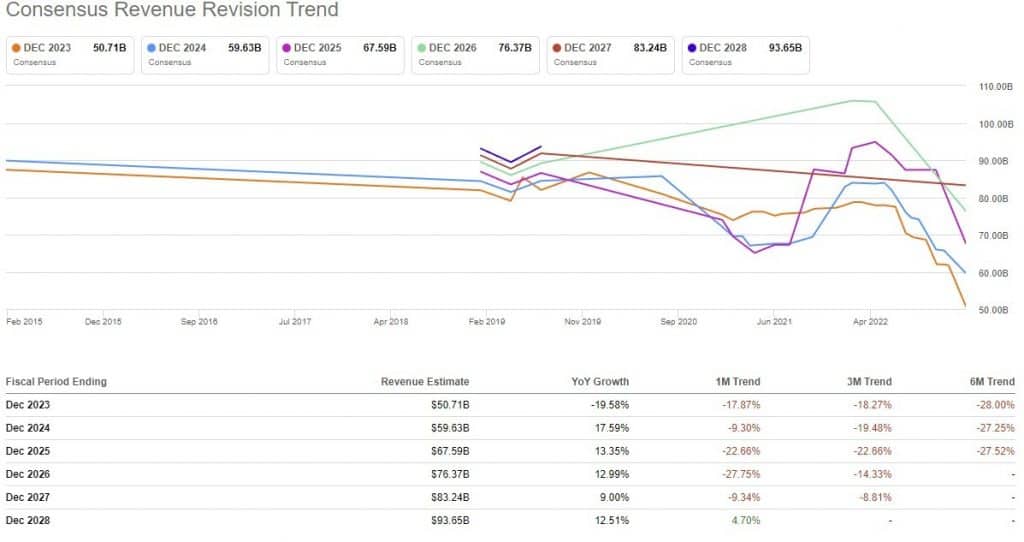 Patrząc na to jak w ostatnim czasie zmieniły się rewizję wyników dla obu spółek i dokładając do tego sporo słabsze prognozy na 1Q23 samych spółek – można mieć spore obawy. INTC: