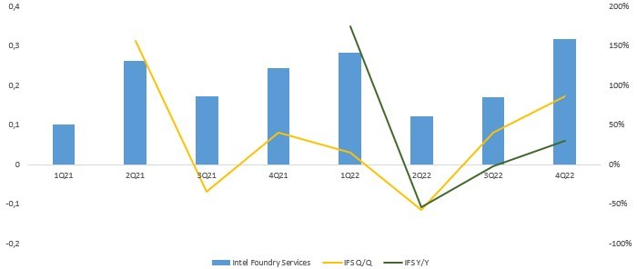 W ostatnich dniach COE Intela informował, że segment IFS ma w tej chwili podpisane umowy o łącznej wartości 4 mld USD. Segment w tej chwili stanowi jedynie około 5% przychodów spółki, ale rozwija się bardzo dynamicznie i może stać się w przyszłości bardzo ważnym ogniwem spółki. IFS urósł Y/Y o 30% natomiast Q/Q o 87%: