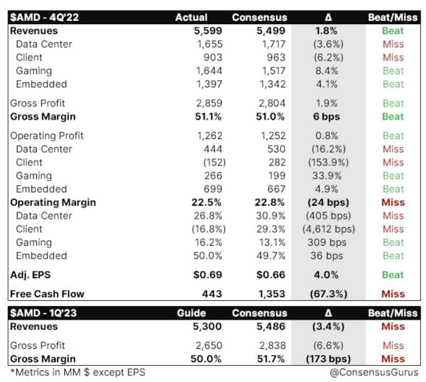 Zdecydowanie jednak słabiej wypada drugi segment – Client – którego przychody wyniosły 0,903 mld USD co oznacza spadek Y/Y aż o ponad 50% natomiast Q/Q o blisko 12%. Tym samym pierwszy raz w ostatnich dwóch latach segment ten u AMD zalicza dużo słabszy kwartał niż u INTC: