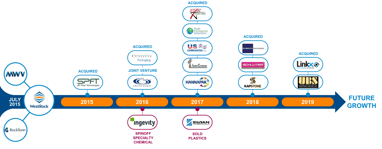 WestRock Company(WRK) to spółka notowana na amerykańskim NYSE zajmująca się produkcją opakowań z papieru i tektury. Spółka powstała w 2015 roku, rozwija się szybko poprzez liczne przejęcia. W 2016 roku WRK kupiło Cenveo Packaging za 105 mln USD, a w 2017 Star Pizza Box największego producenta i dystrybutora pudeł do pizzy: