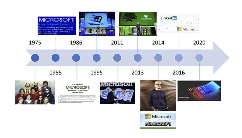 Microsoft: kluczowe wydarzenia w historii spółki – lata 1975 – 2020. Źródło: spółka
