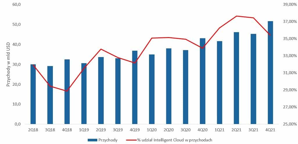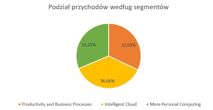 Najdynamiczniej rozwijającym się segmentem, z pewnością jest segment Intelligent Cloud. Jego udział w przychodach rośnie z kwartału na kwartał od 31,93% w roku 2018, do 35,43% w ostatnim kwartale: