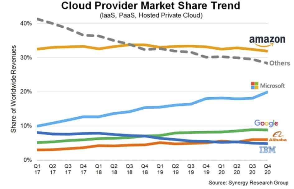 Zgodnie z danymi od Synergy Reasearch Group to MSFT jest najdynamiczniej rozwijającą się spółką w segmencie rozwiązań chmurowych ostatnich lat.