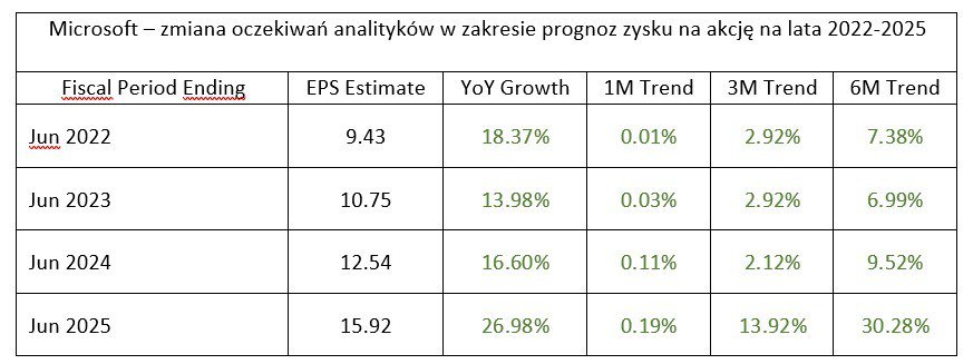 Analitycy w ostatnim czasie regularnie podnosili swoje prognozy zysków na MSFT. W kolejnych latach spodziewane są dynamiki od 14-27% w poszczególnych latach:
