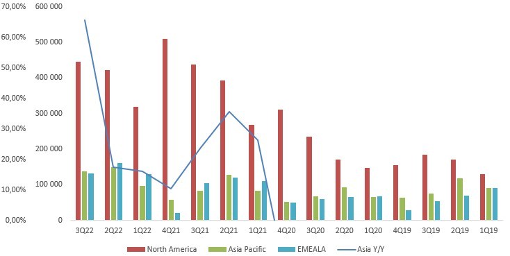 na drugim miejscu uplasowała się z 19% Azja i Pacyfik – jest to najszybciej rosnący rynek: