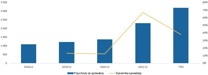 Dynamiki zarówno przychodów jak i zysków w ostatnim czasie są imponujące – przychody za ostatnie pięć lat rosną średniorocznie o blisko 31%: