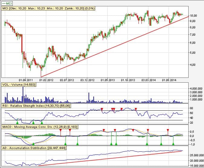 Następnie przefiltrowałem pod względem analizy technicznej: głównie pod względem trendów oraz płynności. Spółki z trendem spadkowym wyleciały od razu na zbity pysk. Trend boczny akceptowałem – jednak nie wiem jeszcze, czy wrzucę te spółki. Dzisiaj jedynie z trendem wzrostowym: Echo oraz MCI!