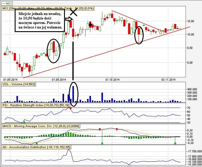 Tutaj wykres się konsoliduje tworząc popularną formację trójkąta. Osobiście już jednak bym pogrywał pod wybicie z zaznaczonej konsolidacji – pod wybicie z 6,50 zł.