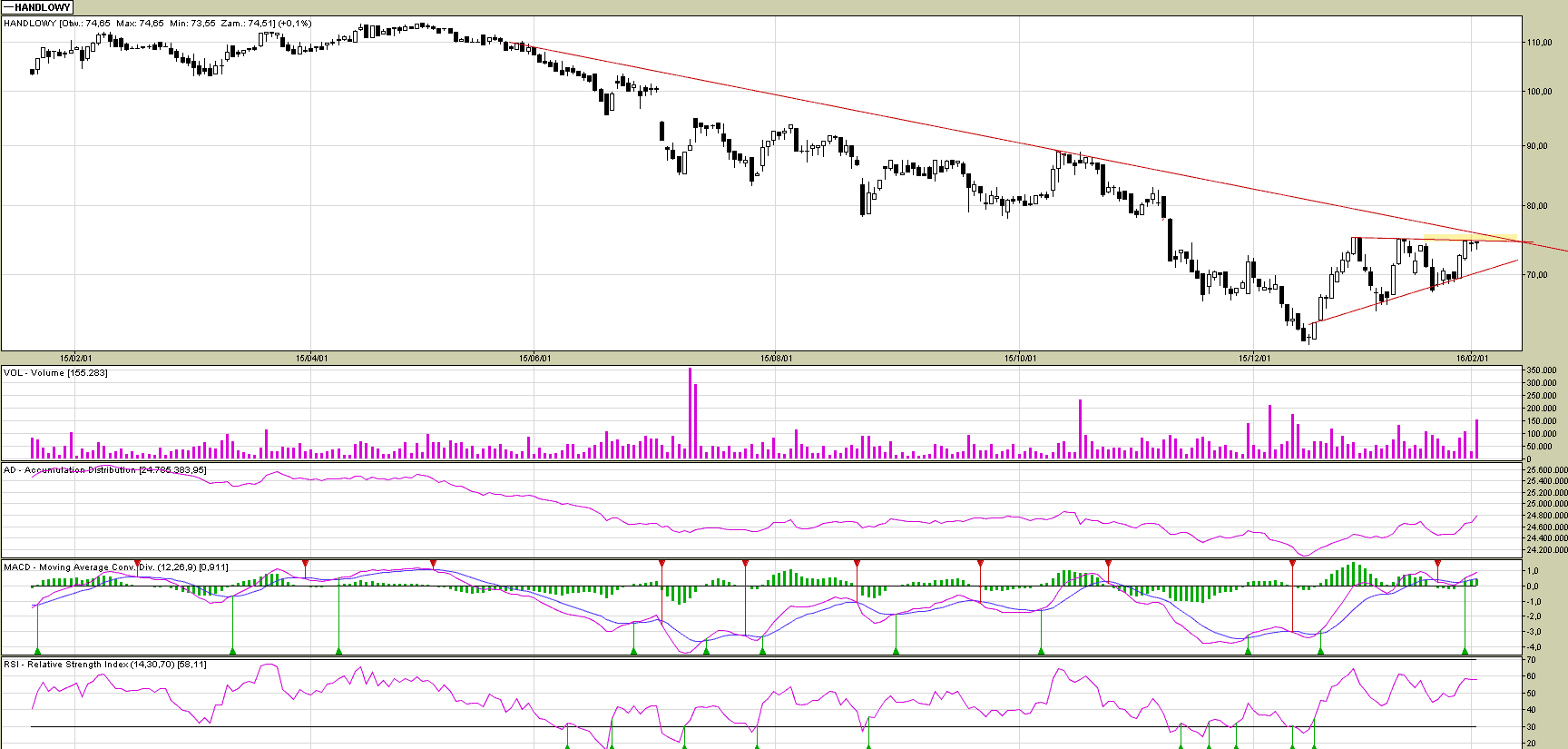 Komentarz: Kurs spółki zmierzy się niebawem ze średnioterminowym trendem spadkowym. Do walki staje natomiast trójkąt zwyżkujący, który formuje się od grudnia zeszłego roku. Gdyby nie nieciekawe otoczenie, to typ nadawałby się jako “pewniak”. W obecnej sytuacji należy spodziewać się ewentualnego fałszywego wybicia, o popyt się uaktywni.