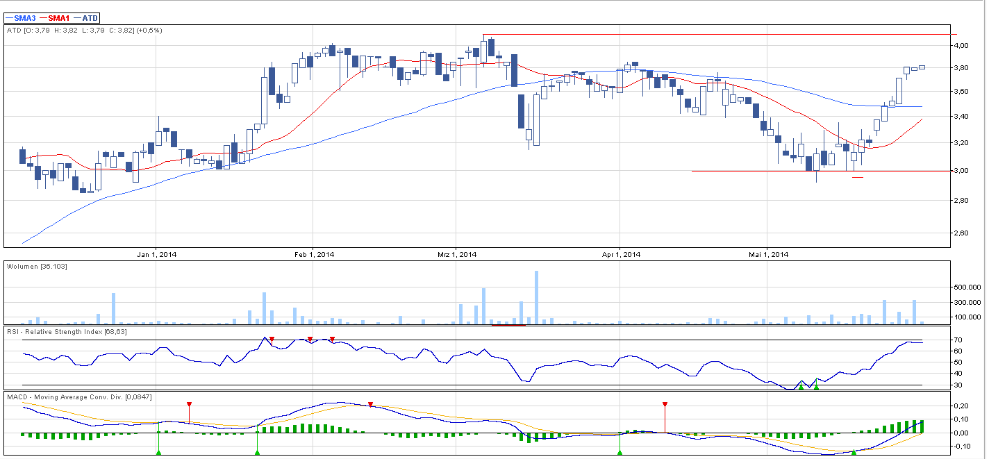 wpis o tej spółce powinien nastąpić dużo wcześniej z powodu pięknego odbicia od poziomu 3zł oraz należytego sygnału MACD. Na obecną chwilę uważam, że spółka zdecydowanie walczy o przebicie na poziomu 4,1. W notowaniach widać również, że nie pozwalają na to, by kurs leciał w dół. Martwi jedynie wysokie RSI; ale i ono jest póki co na “tak”.