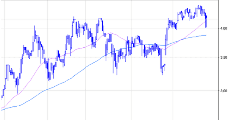 Tutaj akurat znajdujemy się nad oporem, 4,11 zł / 4,17 zł. Próba spadków ostatecznie się nie udała, ponieważ ostatnie świeczki miały długi dolny cień, a zamknięcie było nieco wyżej. Świeczka z długim dolnym cieniem oznacza jedno – czyści Stop Lossy! Dlatego też tak ważne jest, aby ustawiać zlecenia SL dopiero poniżej ostatniej zamkniętej świeczki, jeżeli nadchodzą takie przesłanki. LimAkt: 4,26 do 4,28 i można cieszyć się paroma %.