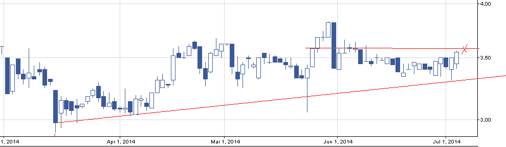 Znajdujemy się nad wyrysowanym wsparciem, kurs próbuje przebić zaznaczony poziom. Przebicie go będzie sygnałem do zakupu, zatem LimAkt: 3,58