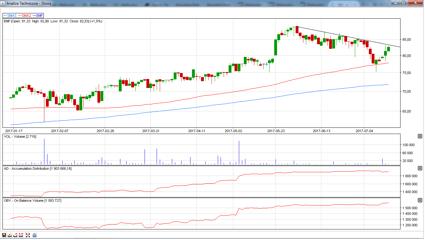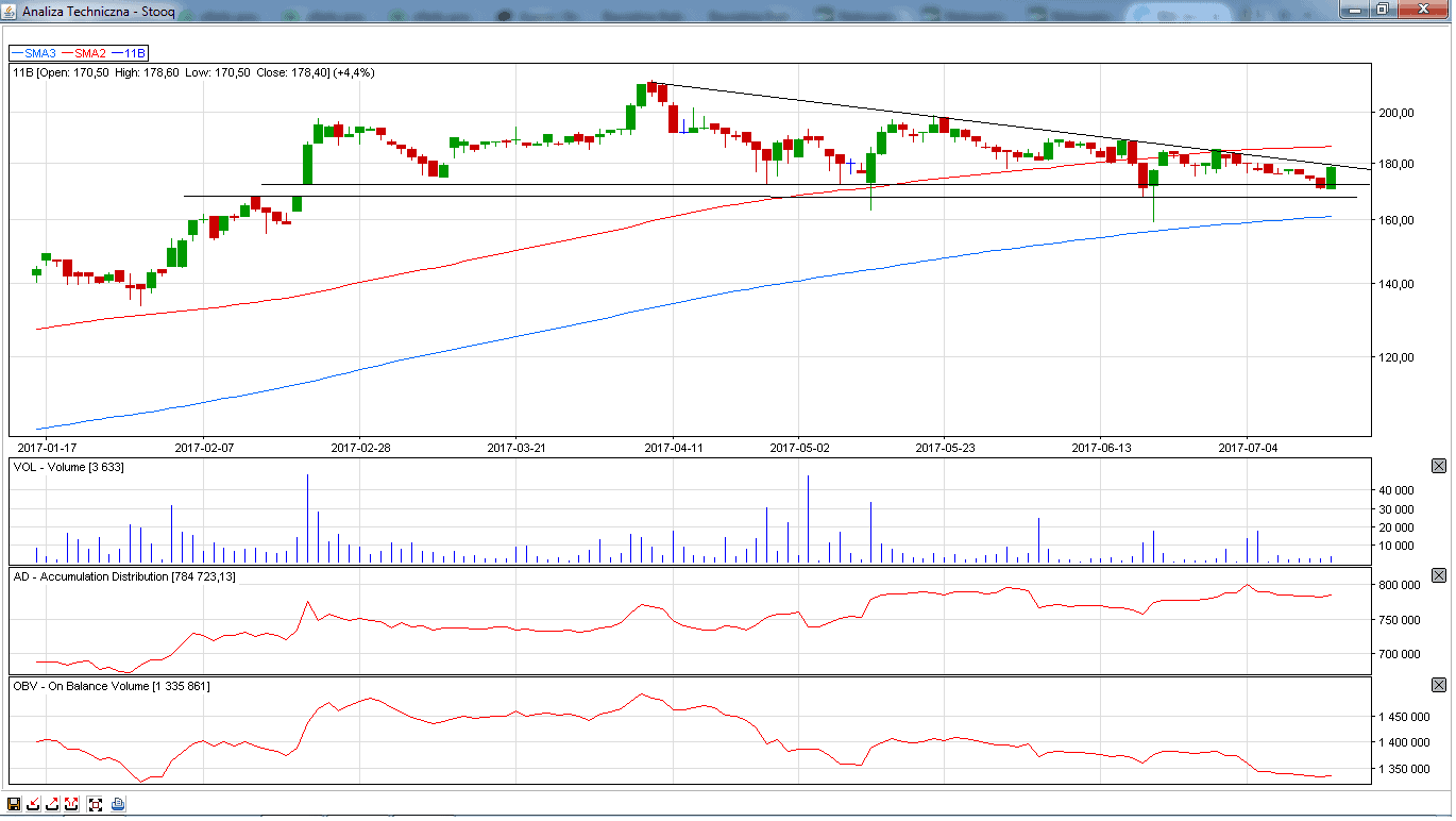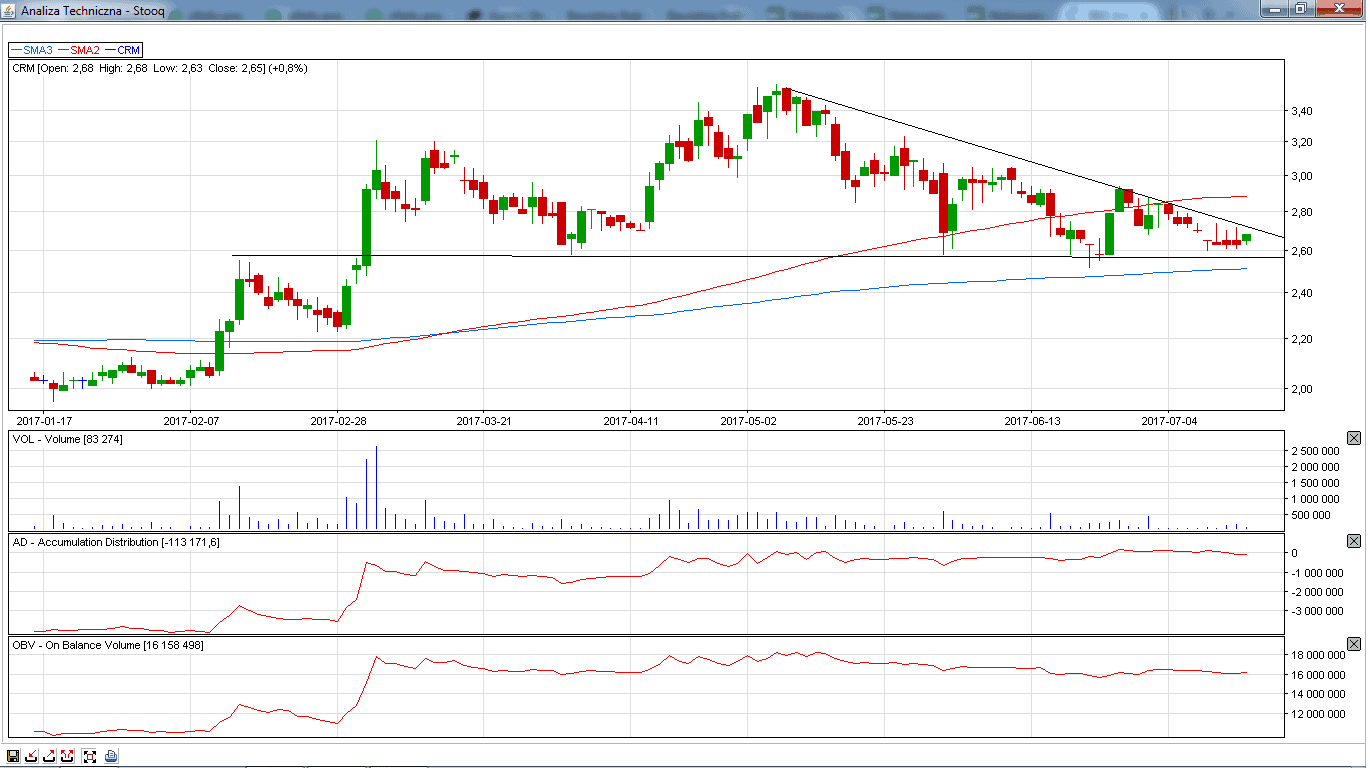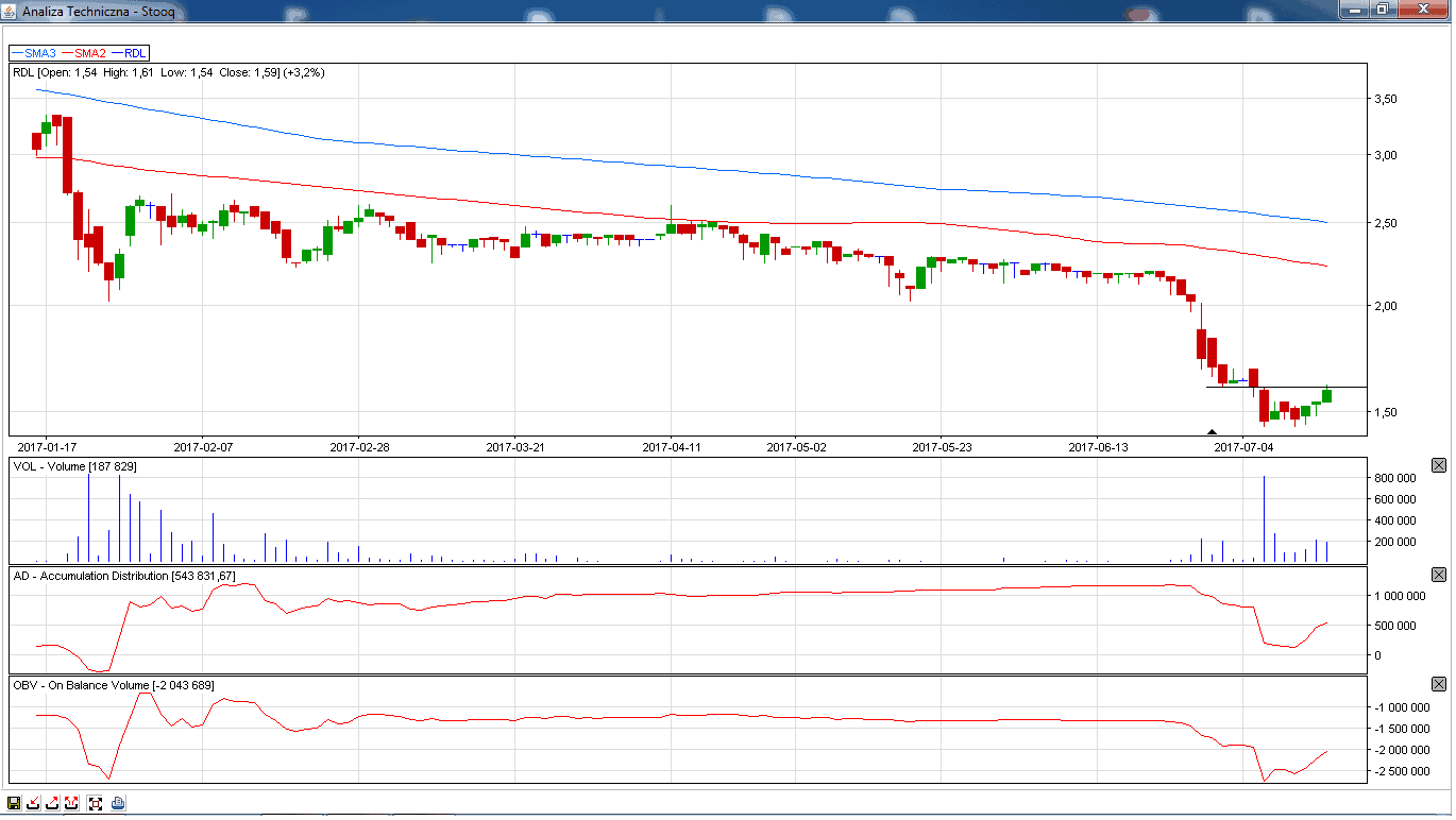 Na koniec zostawiłem spółkę w trendzie spadkowym. Kurs spółki po mocnych spadkach na podwyższonym wolumenie zaczyna wykazywać chęć co najmniej odbicia korekcyjnego. Wskaźniki Ad/OBV wskazują na akumulację akcji. Zagrywamy na przebicie poziomu 1,60 zł.