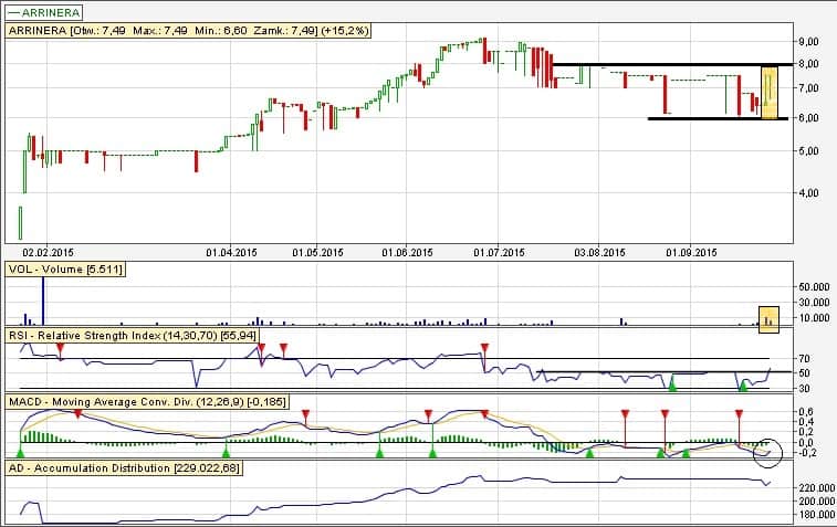 Do ostatnich spółek spekulacyjnych Błażeja dodaję jeszcze Arrinera (ARX). Właścicielem większościowym tej spółki jest Erne, która po przebiciu naszego przykładowego LimAkt 1,53 z lipca urosła już o +124,18% (analiza techniczna Erne z dnia 02.07.15). Aktualnie główną inwestycją Erne jest właśnie ta spółka.