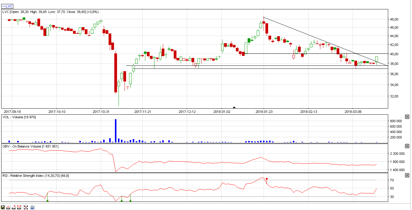 Kurs spółki po dokonaniu korekty wybił się przez linię korekty, ale na drodze znajduje się jeszcze opór na 40 zł. Zagrywamy dopiero po przebiciu tego oporu.
