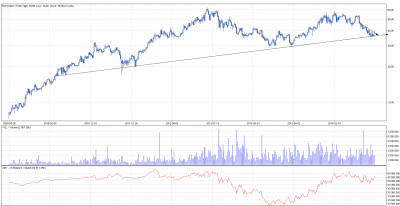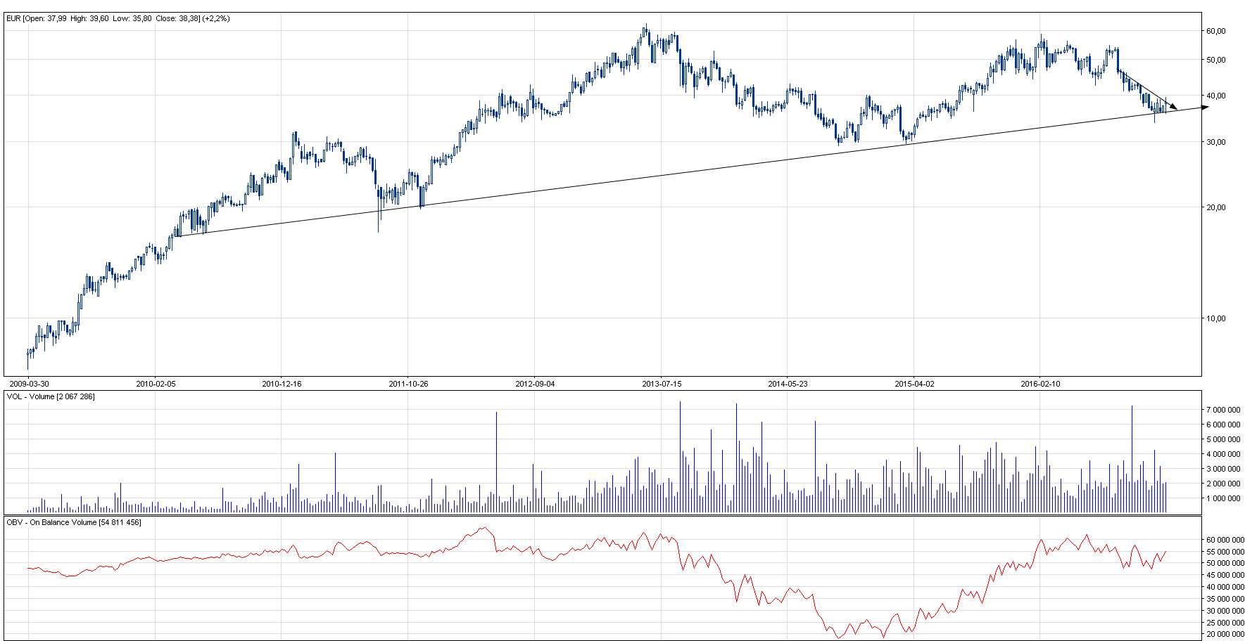 Eurocash znalazł się u wielu inwestorów na liście “nie dotykać” po tym, jak od początku roku stracił prawie 35% łamiąc po drodze okrągłe 50 czy 40 zł. Zdecydowałem się spojrzeć na wykres spółki, która w dalszym ciągu tkwi w długoterminowym trendzie wzrostowym, i zauważyłem, że całokształt wykresu nie wygląda aż tak źle jak mogłoby się wydawać: