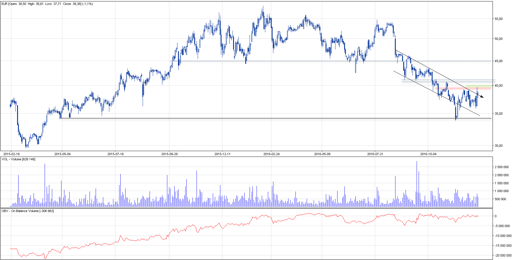 Wykres dzienny jest obrazem, jaki inwestorzy krótkoterminowi mieli przed oczami przeglądając na szybko indeks spółek blue chips. Z tej perspektywy faktycznie sytuacja nie wygląda rewelacyjnie, ale zauważalna jest obrona wsparcia na ~34 zł oraz kanał spadkowy, którego górne ograniczenie jakby miało poddać się sile popytu. Zagrożeniem pozostaje mała luka spadkowa z ostatnich dni, której pełne domknięcie będzie jednoznacznym sygnałem kupna. Reasumując, to mamy do czynienia z przecenioną spółką , która nie zanegowała swojego głównego ruchu wzrostowego.