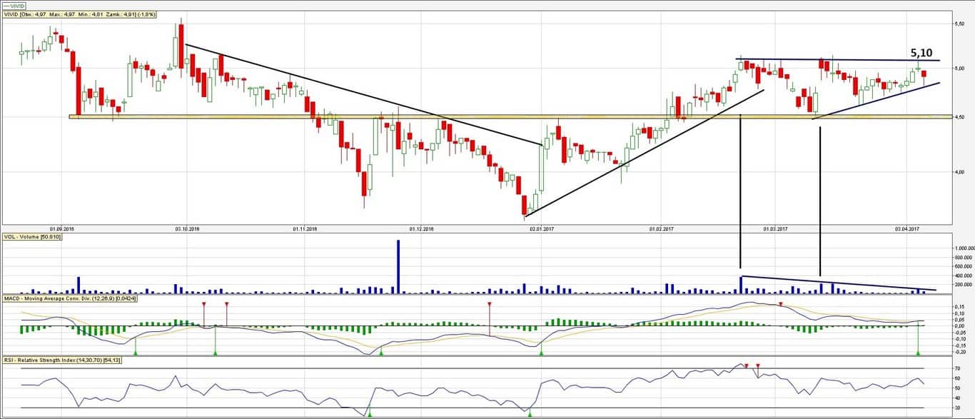 ♠ Na wykresie spółki Vivid kształtuje się natomiast klasyczny trójkąt zwyżkujący.