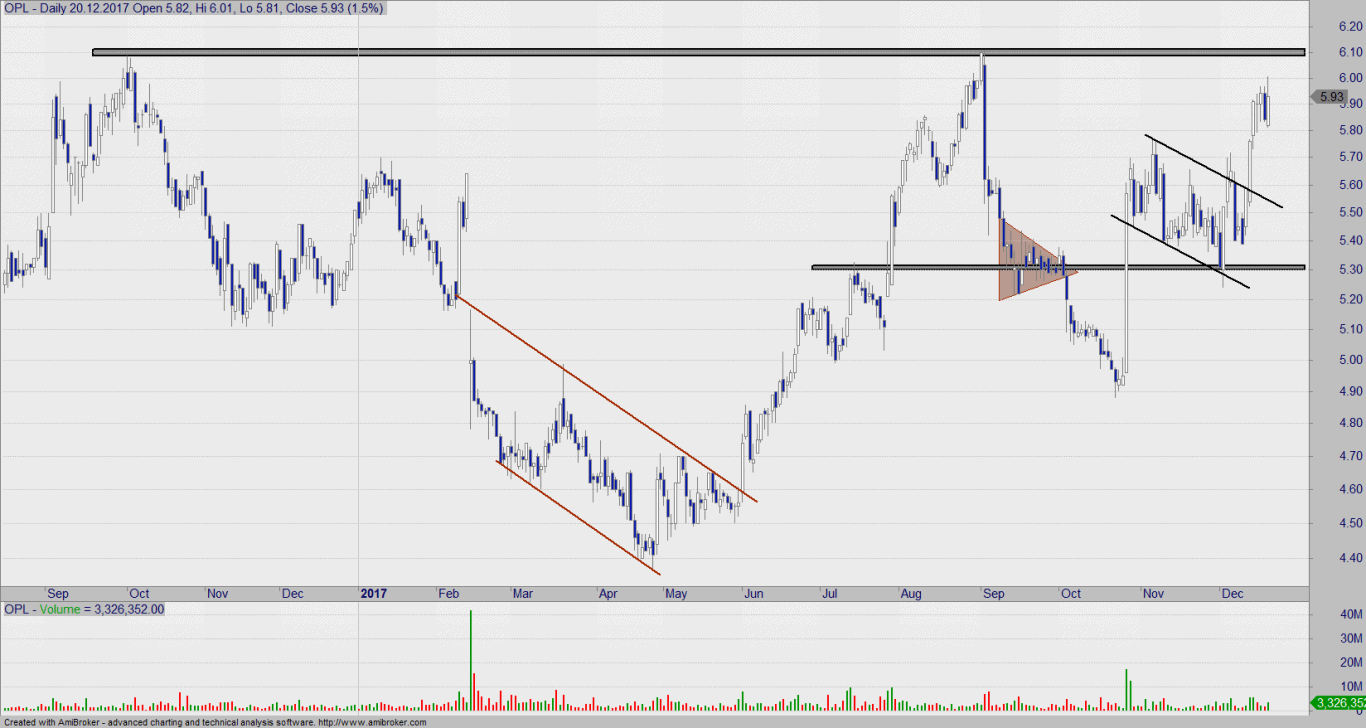 Powoli widzimy, że kurs ponownie podchodzi pod okrągłe 6 zł, które w perspektywie roku już dwukrotnie okazało się być istotnym oporem. Dlaczego walor trafia na tapetę? “Pomarańcza” znajduje się we wzrostowych nastrojach, co potwierdza wybicie z formacji flagi parę dni temu. Test oporu, to kwestia czasu, a jego wybicie, to zaproszenie do powalczenia o nowe szczyty, wstępnie w okolicy następnego oporu przy 7 zł.