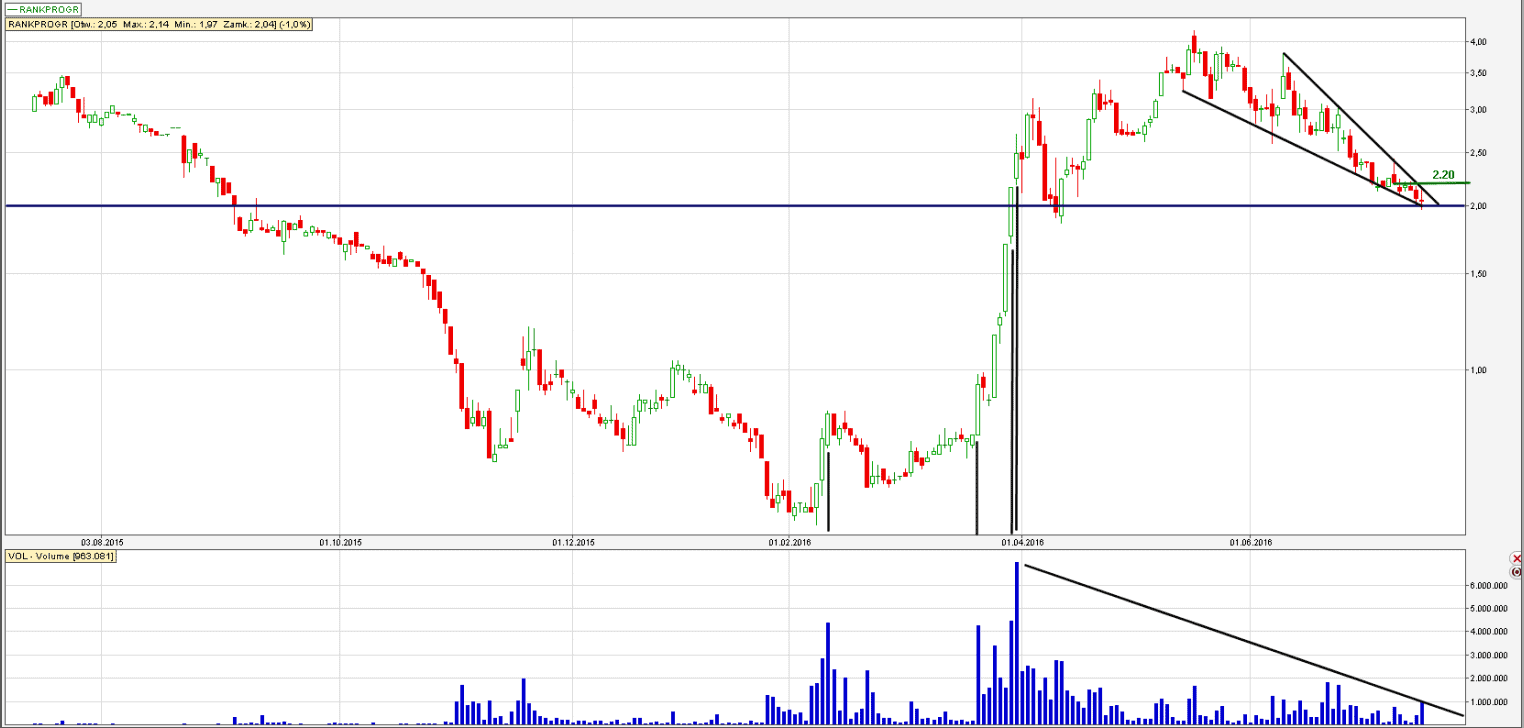 Tym razem analiza spekulacyjnej spolki: RankProgress. Na wykresie spolki dynamiczne, szybkie wzrosty, jak i spadki sa na porzadku dziennym. W trendzie spadkowym od poczatku notowan. Do tego branza deweloperska, ktora podatna jest na spekulacje.