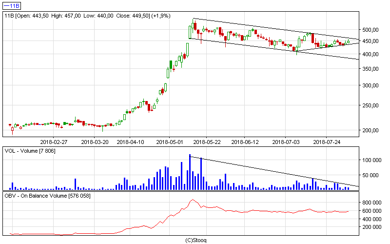 Na wykresie spółki widzimy, że po mocnej fali wzrostowej kurs znajduje się w trakcie korekty tworząc formację flagi. Jest to formacja pro wzrostowa i można się spodziewać kontynuacji wzrostów po wybiciu z tej formacji. Na wykresie dziennym widzimy, że kurs zbliża się do górnego ograniczenia formacji, przy czym pozytywne jest zmniejszanie się wolumenu w trakcie tej formacji. Pierwszym oporem są okolice 500 zł, natomiast wsparciem będzie poziom 450 zł. Zagrywamy na wybicie z formacji flagi.