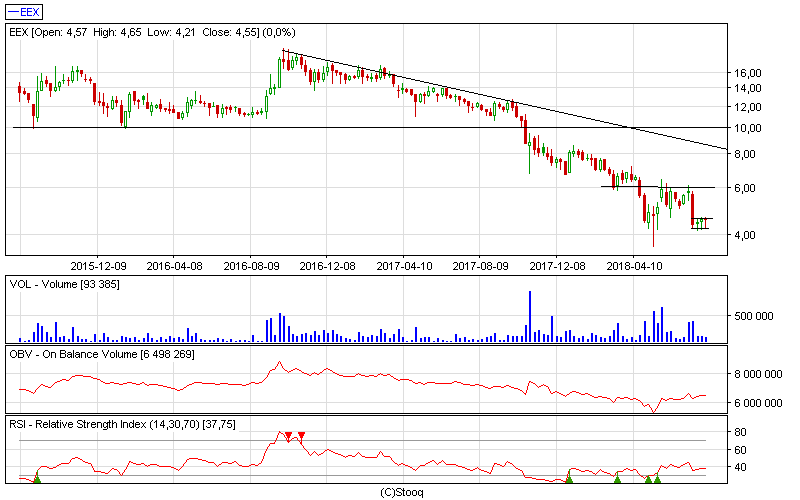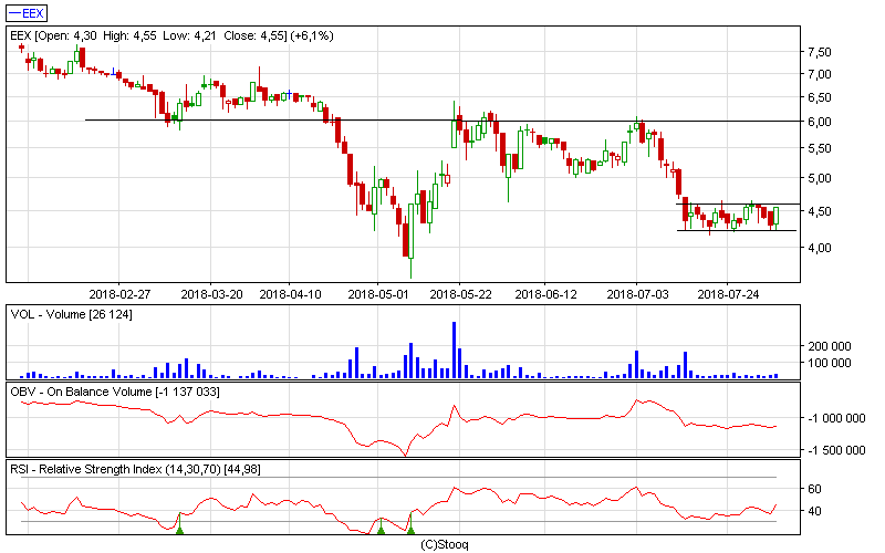 Kurs porusza się w długoterminowym trendzie spadkowym. Aktualnie kurs porusza się w dość wąskim kanale bocznym. Najbliższy opór po wybiciu powinien się znajdować w okolicach 6 zł, natomiast wsparcie to dolne ograniczenie kanału, czyli okolice 4,20 zł. Zagrywamy na wybicie z kanału górą.