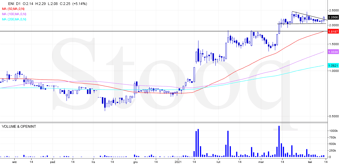 Od połowy stycznia kurs spółki znajduje się również w trendzie wzrostowym. Aktualnie mamy do czynienia z konsolidacją kursu w kształcie a’la formacji trójkąta zniżkującego, z którego na ostatniej sesji doszło do wybicia górą, dlatego można oczekiwać dalszych wzrostów kursu w kierunku mocniejszego oporu na poziomie 4,8 zł. W oczy “rzucają się” spore wolumeny na świecach wzrostowych. Lokalne wsparcie można wyznaczyć w okolicach 2,05 zł a kolejne przy poziomie 1,8 zł. Uważam, że można spróbować zagrywać na kontynuację dalszych wzrostów przy kupnie w okolicach zamknięcia z ostatniej sesji.