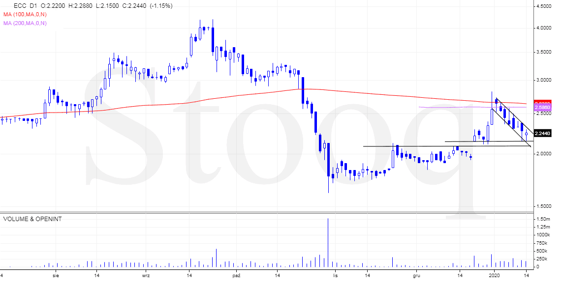 Staram się publikować spółki do zagrania co najmniej na kilka sesji. Przy ECC wczoraj doszło do wybicia z wyrysowanej formacji a najbliższy opór znajduje się przy średniej SMA100.