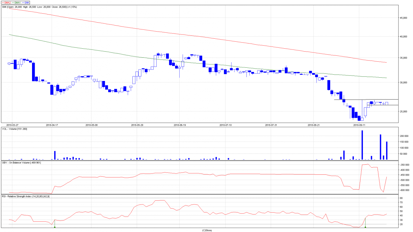 Na wykresie tygodniowym kurs porusza się wewnątrz wyrysowanego klina rozszerzającego się. Nie jest to może idealne miejsce do zajęcia pozycji, ale patrząc na znaczące wolumeny na ostatnich świecach można oczekiwać przynajmniej korekty do górnego ograniczenia tego klina. Na wykresie dziennym po fali świec spadkowych mieliśmy do czynienia z uformowaniem się świecy odwróconego młota na znaczącym wolumenie, a następnie po lekkich wzrostach doszło do konsolidacji. Czekamy na wybicie górą z konsolidacji. Najbliższy większy opór znajduje się w okolicach 31 zł a wsparcie w okolicach 25,6 zł.