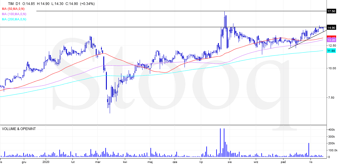 Kurs akcji znajduje się w długoterminowym trendzie wzrostowym. Aktualnie na wykresie pojawił się opór w okolicach 15 zł, który zatrzymał na chwilę dalsze wzrosty. Pod koniec października utworzona została w okolicach linii SMA50 krótka świeca na znaczącym wolumenie, która moim zdaniem świadczy o akumulacji. Dlatego oczekuję wybicia aktualnego oporu i otwarcia drogi dla kursu w kierunku oporu wyznaczonego przez maksimum świecy wzrostowej z 28.07.2020. Za lokalne wsparcie może posłużyć linia skośna tuż poniżej bieżącego kursu. Zagrywamy na wybicie górą oporu.