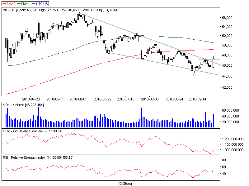 Na wykresie tygodniowym kurs porusza się wewnątrz klina zniżkującego, który docierając do wsparcia wyznaczonego w okolicach 45 $ wykazuje chęć na wybicie górą i zakończenie korekty. Pierwszym oporem są okolice 52 $ a następnie 55 $. Na wykresie dziennym kurs w piątek wybił się z klina tworząc mocną świecę wzrostową na zwiększonym wolumenie, dlatego będziemy zagrywać na kontynuację wybicia.