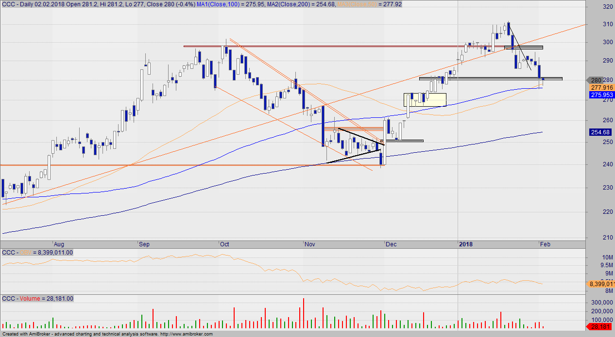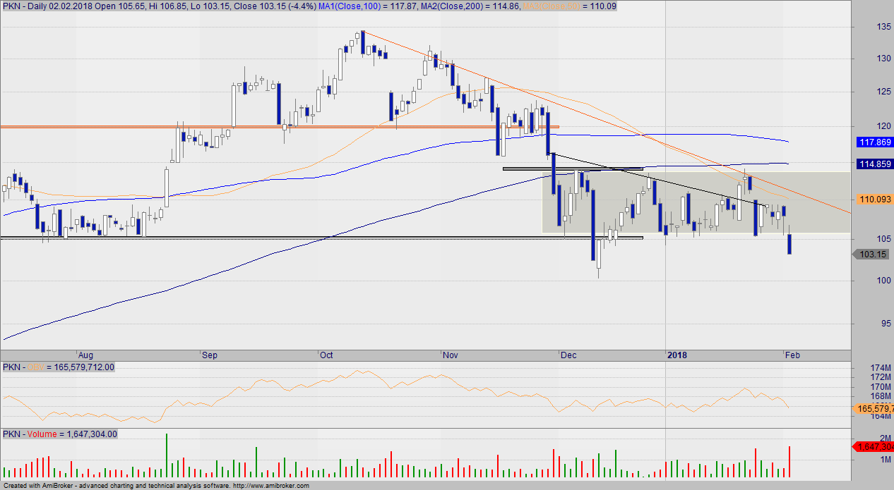 Niestety petrochemiczny olbrzym wybił się z boczniaka i teraz wyłącznie obrona przy okrągłej setce nie spowoduje dalszej lawiny spadków. Wybicie setki, to sygnał na shorta.