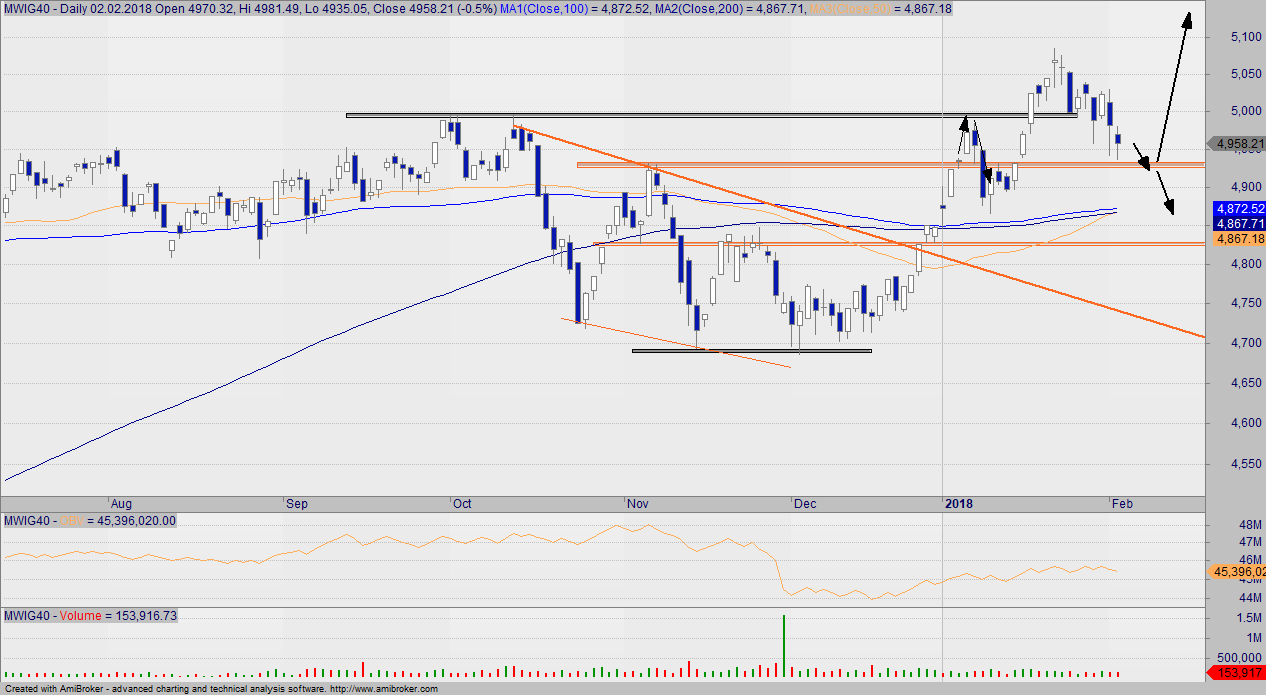 Chwila prawdy na średniakach, bo i tutaj sytuacja jest podobna do tej na WIG20. Indeks po wyłamaniu kolejnego wsparcia zmierzy się z pękiem średnich, a jego wybicie skutkować będzie mocną podażą. To, że nie wiemy co dalej wskazuje świeczka z długimi knotami.