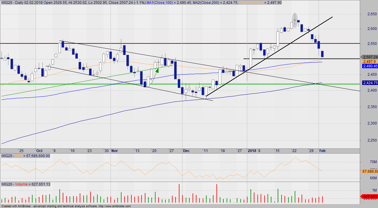 Przewidywałem korektę do 2550, ale na koniec tygodnia wybili kolejne wsparcie na 2510. O ile spadki się tutaj nie zatrzymają, to lecimy na 2450, jak nie do 2430. Sprawa jest o tyle poważna, że SP500 rozpoczęło pierwszą od dawna korektę, a to naturalnie odbija się na nas.