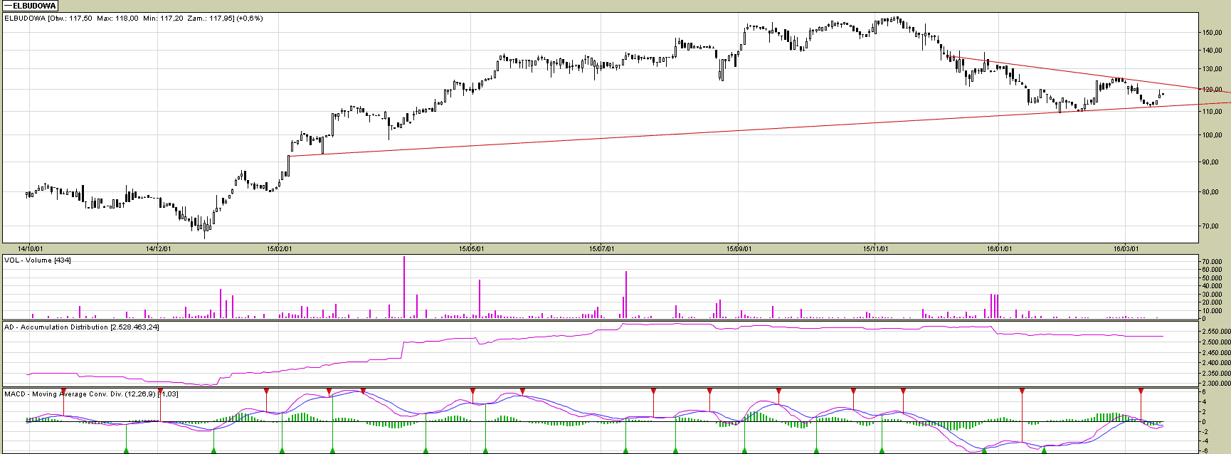 Długoterminowy trend wzrostowy Elbudowy poddawany jest mocnym zawirowaniom. W ostatnich tygodniach kurs spółki testował średnioterminową linię trendu spadkowego, a na ostatniej sesji domknął małą lukę spadkową. Zdaje się, że niedługo będziemy mieli powtórkę testu lokalnego oporu, tym razem na poziomie 123 zł. Oprócz tego walor zasługuje na uwagę przez tworzący się sygnał kupna na wskaźniku MACD – może to być decydującym paliwem do przełamania zniżkującej linii.