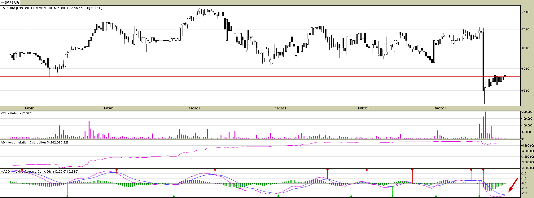 Podobnie jak w przypadku powyższym, Emperia jest blisko utworzenia sygnału kupna na wskaźniku MACD, a sam kurs zmierza się z oporem na poziomie ~58,5 zł. Ciekawie wygląda także fakt, że de facto doszło do mocnych zniżek, ale wolumen świeczki następującej po spadkach jest zdecydowanie wyższy od wolumenu czarnej świecy. Czy będzie miało to przełożenie na przyszłość kursu?