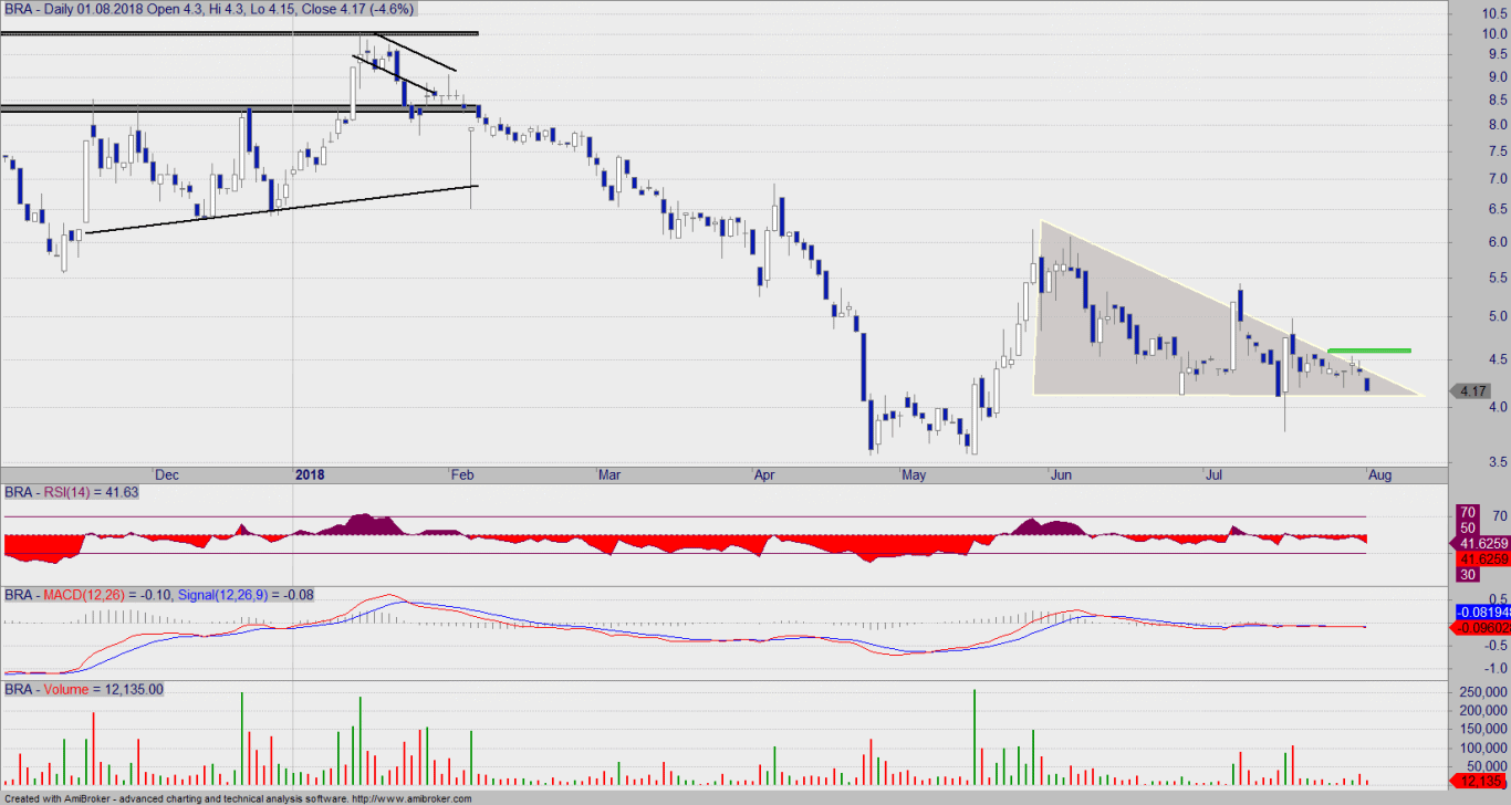 Ulubieniec spekulantów, niegdyś gwiazda start-upów brylująca na przeróżnych portalach czy w telewizji. Braster przypomina historię jakich wiele: świetny, innowacyjny pomysł, dobry PR, rosnący kurs, a następnie wielkie rozczarowanie, bo model biznesu się nie sprawdza, sprzedaż produktu nie taka, no i w końcu spadający kurs. Jest to jednak walor z technicznym podejściem wykresu, stąd też bez problemu możemy przyjąć, że kształtuje się tutaj trójkąt zniżkujący – potencjalne zagranie jest na wyciągnięcie ręki. Spekulanci mógą próbować swojego szczęścia przy 4,10 (wsparcie) z ciasnym SL. Zachowawcze zagranie jest zgodnie z LimAkt nad górne ograniczenie trójkąta.