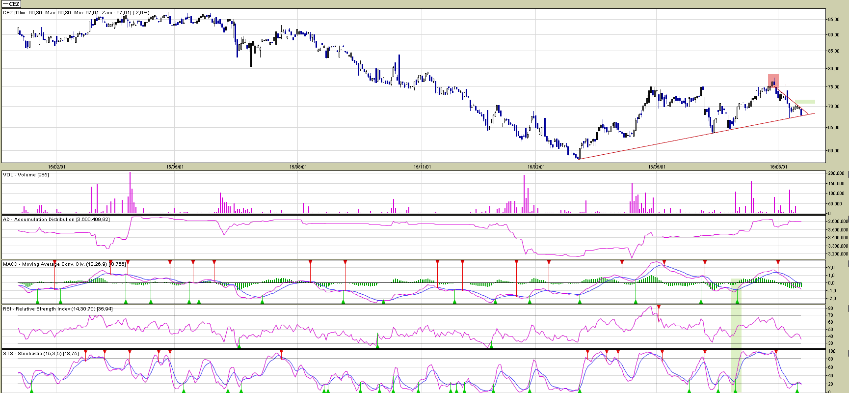 CEZ wypada z listy obserwacji po przebiciu się przez zwyżkującą linię. GRI nadal pod lupą.