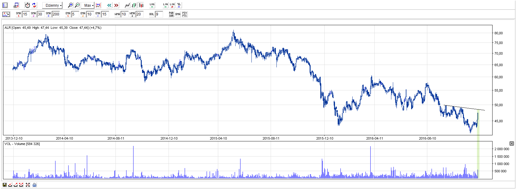 Na Aliorze mamy trend spadkowy w długim terminie, który w ostatnich tygodniach zaliczył nowe minimum na 41,62 zł. Od dwóch dni widzimy na walorze “zasłużone” odbicie, które poparte jest zwiększonym obrotem. Obok BOS jest to technicznie najbardziej zdołowany bank, ale nadal nie możemy mówić o zmianie układu sił.