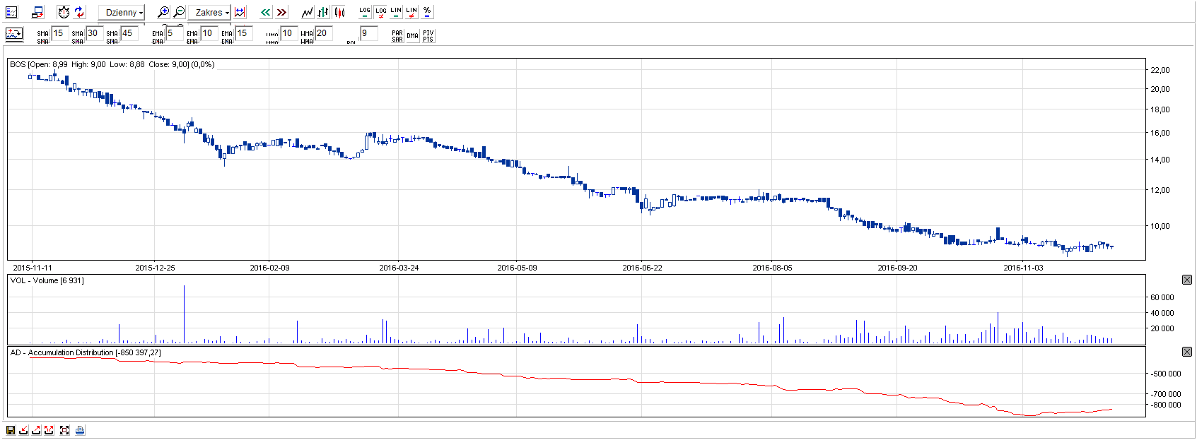 Na BOŚ widoczna jest mała akumulacja akcji przy historycznym dnie. Bank zdołał poprawić wyniki finansowe w III. kwartale, ale póki co nie przełożyło się to na notowania. Podobne formowanie dna miało miejsce przy 11 zł, jednakże wtedy kurs zdecydował zejść niżej. Czekamy czy dojdzie do wyraźniejszego wzrostu akcji w najbliższym czasie.