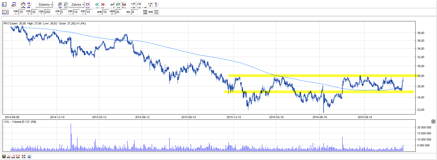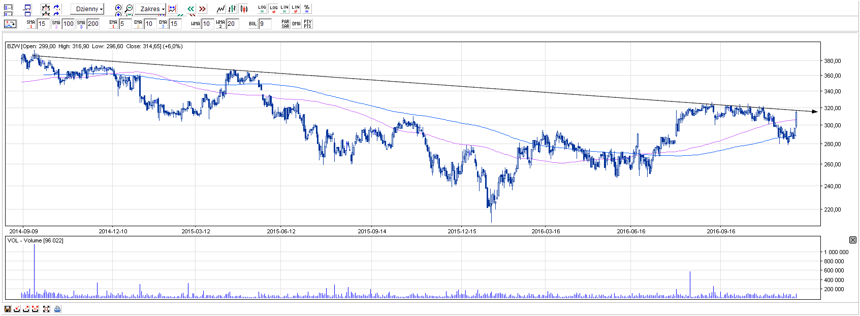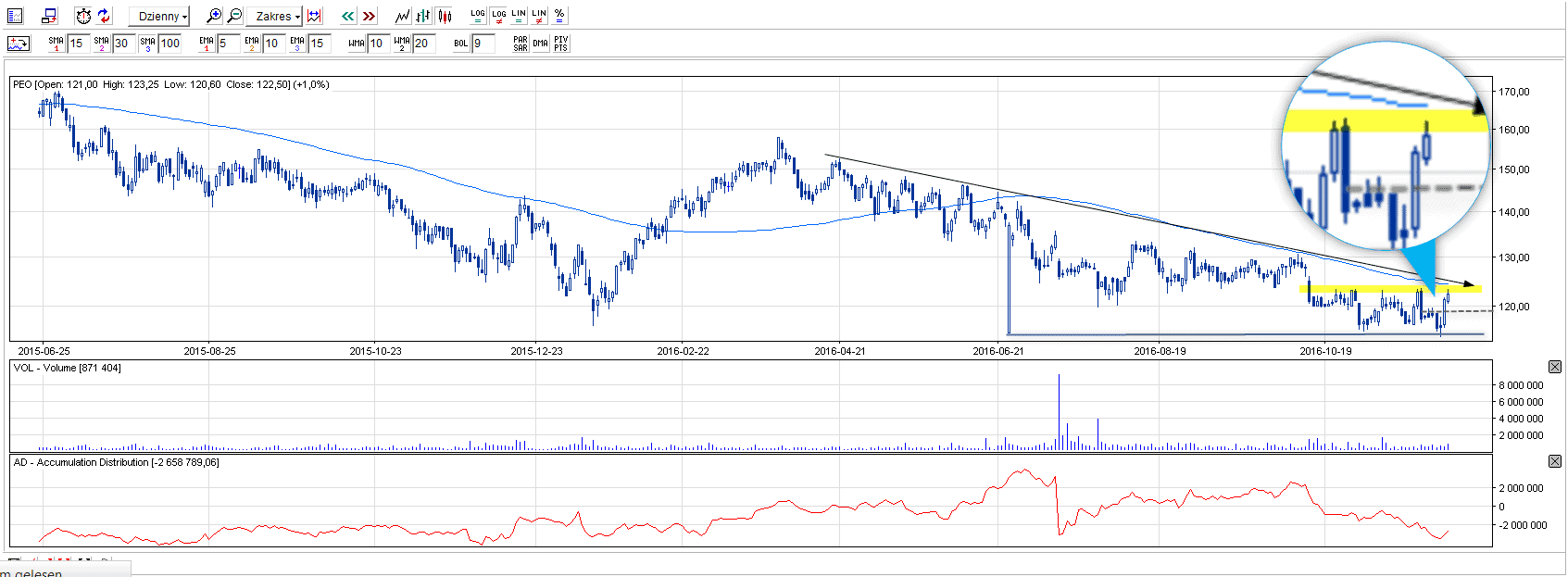 PEO nadal znajduje się w długoterminowym trendzie spadkowym, a ostatnie sesje sprawiły, że kurs spółki zmierzył się ze znaczącą spadkową linią. Wydawałoby się, że już tak niewiele brakuje do zmiany trendu, zwłaszcza, że w zeszłym tygodniu kurs bez powodzenia testował czteroletnie dno. Prawdziwym arcydziełem będzie zatem wybicie się nad średnią kroczącą SMA100, która zbliżona jest ruchem do wspomnianej linii trendu spadkowego.