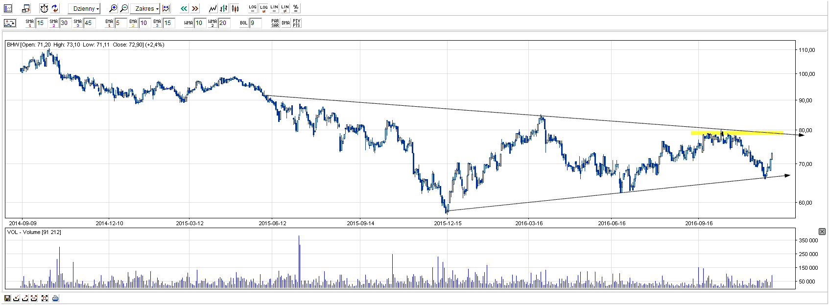 Także na Handlowym mamy do czynienia z odbiciem się od wsparcia, tutaj jednak wsparcie stanowi krótkoterminowa linia trendu wzrostowego. Pozytwnie wygląda sekwencja wyższego dołka, ale czy będzie i wyższy szczyt?