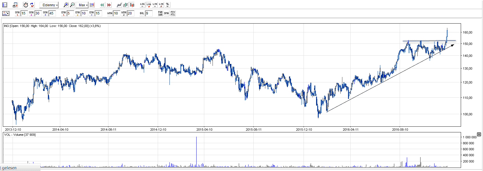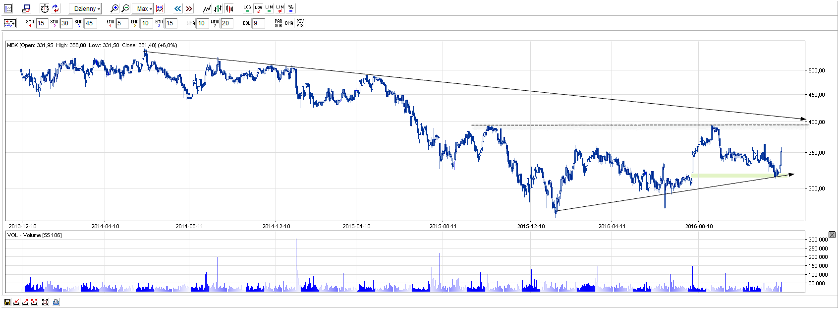 Jedyny na polskim rynku bank, który może pochwalić się ciekawym trendem wzrostowym. Ostatnio doszło do wybicia z formacji trójkąta zwyżkującego, co w konsekwencji wprowadza walor na historyczny szczyt.